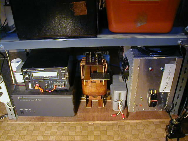 オペデスク?下。左下は旧1296HPA用12V電源。その上は12V雑電源。右端は432HPA用電源。