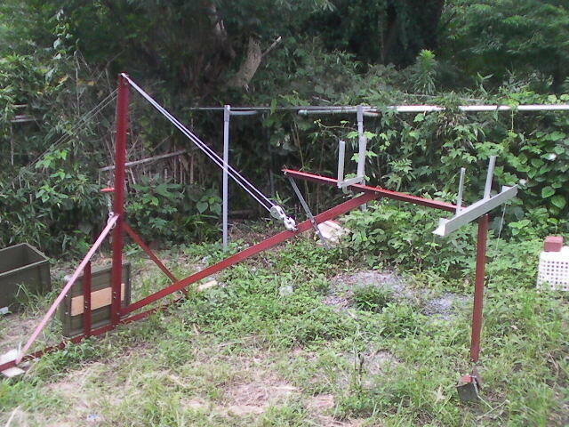 年をとるとともに 腕力がおぼつかなくなり、432用10kgのfeedを脚立の上に持ち上げ、振り回し、 取り付け穴にあわせる作業は 危険になってきたので 着脱支援機?なるものを作ってみた。 最初はクレーン方式でやってみたが 差しさわりが多くて 失敗。 それではと 下から持ち上げるリフト方式?にしてみたところ 何とか使えそうな形になった。 あとは実際に位置決めをしないといけないが ここ2-3日梅雨の大雨予報が出ていて 思わしくない。 (2022.06.20.)