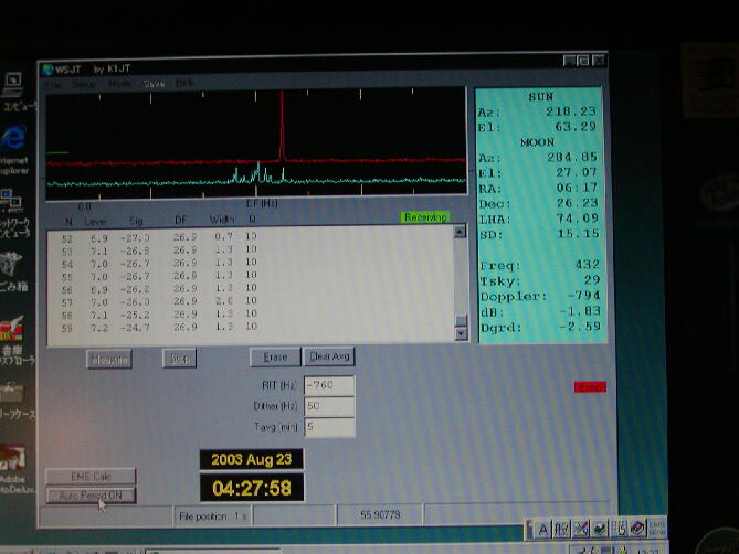 「JT44ってパソコン同士がQSOしたものを人間が横取りするわけでしょう・・・そんなの許せない・・・」 と久留米や太宰府のOMと話していたところ、8月3日にJA4BLCさんから「10W位でQ=10(満点)の エコーが得られた」とメールが入る・・・チョット待てよ、今のEMEは環境に恵まれた一部の特権?階級の もので人口が増えないのはCWと資格と電波環境にある・・・JT44はこれらを満たしてくれるのでは・・・。