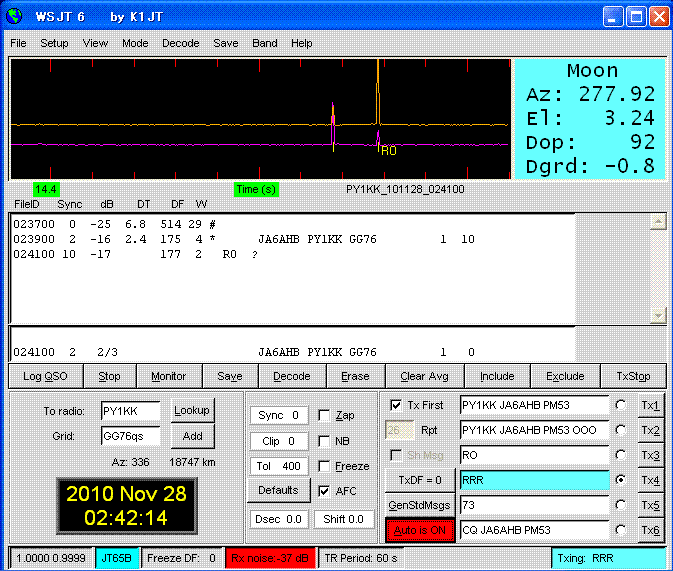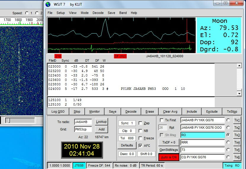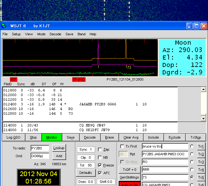 PY2BS〜JA6AHB 18,853km 2012.11.04 NEW EME Dx world record of 432. JT65B